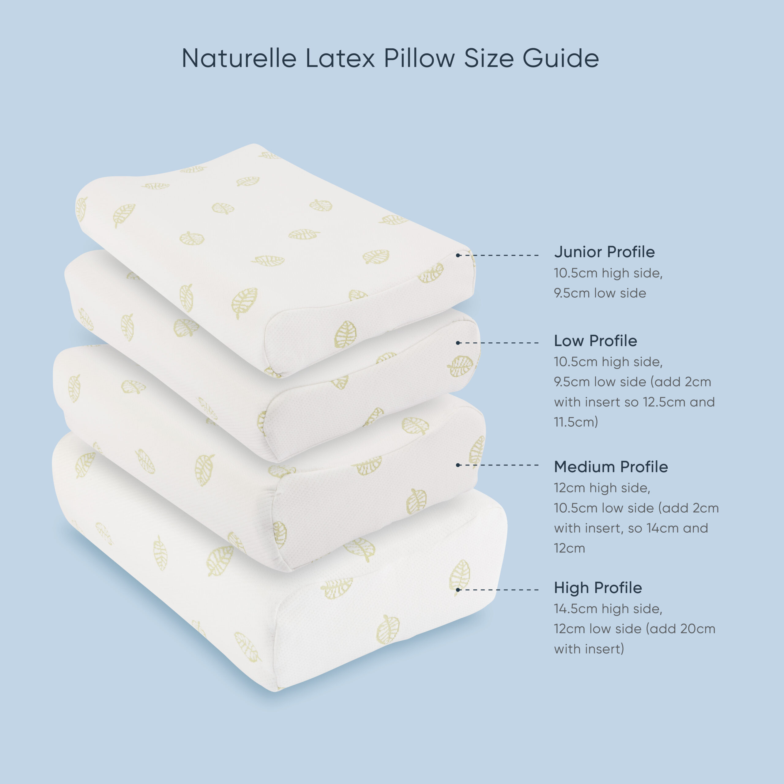 3 sizes to suit all body shapes and sleeping preferences – Low, Medium & High (all sizes come with extra 2cm layer to make pillows higher if you choose).